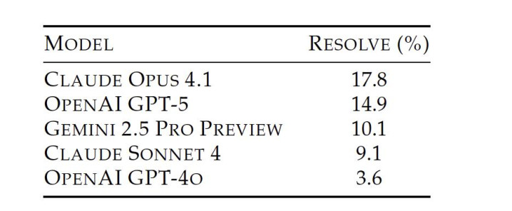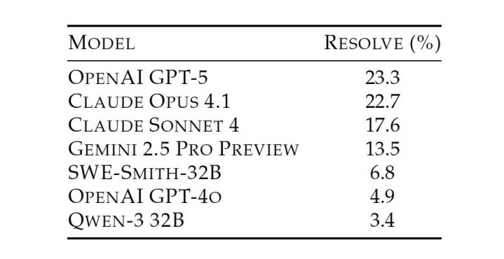 GPT-5、Claude Opus 4.1、Gemini 2.5分别以23.3%、22.7%、13.5%的解决率“荣”登前三。