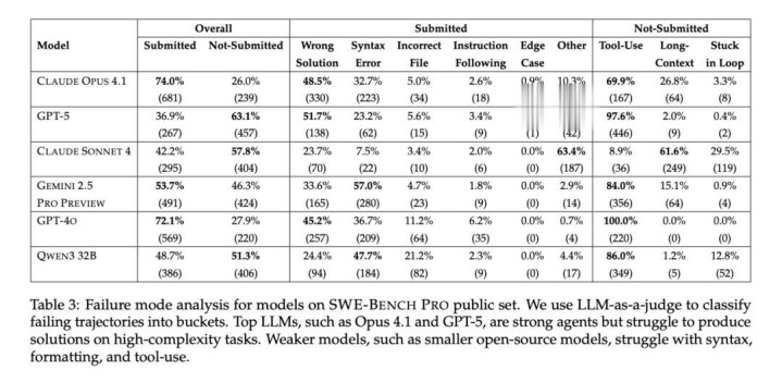 正如我们开头提到的,大语言模型在SWE-BENCH PRO上的解决率仅为中等水平,远低于SWE-Bench Verified中的70% 。