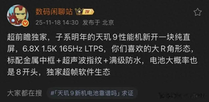 核心爆料点总结:· 屏幕:可能搭载6.8英寸165Hz LTPS OLED “1.5K”屏。· 电池:容量可能达到约8000mAh。· 设计与防护:暗示更强的防水能力与金属中框。· 芯片:预计搭载天玑9系列芯片,可能是天玑9500 Plus。· 发布时间:预计2026年中,后续可能推出全球版本。