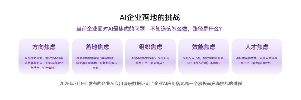 根据MIT 2025年7月发布的《The GenAI Divide——State of AI in Business》研究报告,企业AI应用普遍面临“高采用、低转化”的挑战:60%的组织评估过定制或采购企业级AI工具,但仅5%实现规模化推广应用。业务学习能力差距和业务适配能力差距成为企业AI内部应用受阻的两大鸿沟。