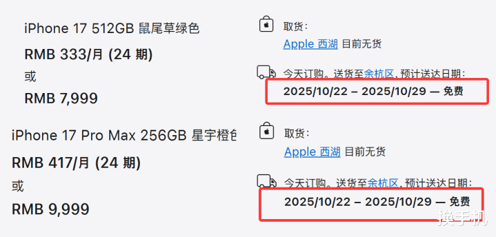 目前,苹果官网显示,现在下单的话,iPhone 17系列的预计送达时间,已经延迟到了10月22日-29日。